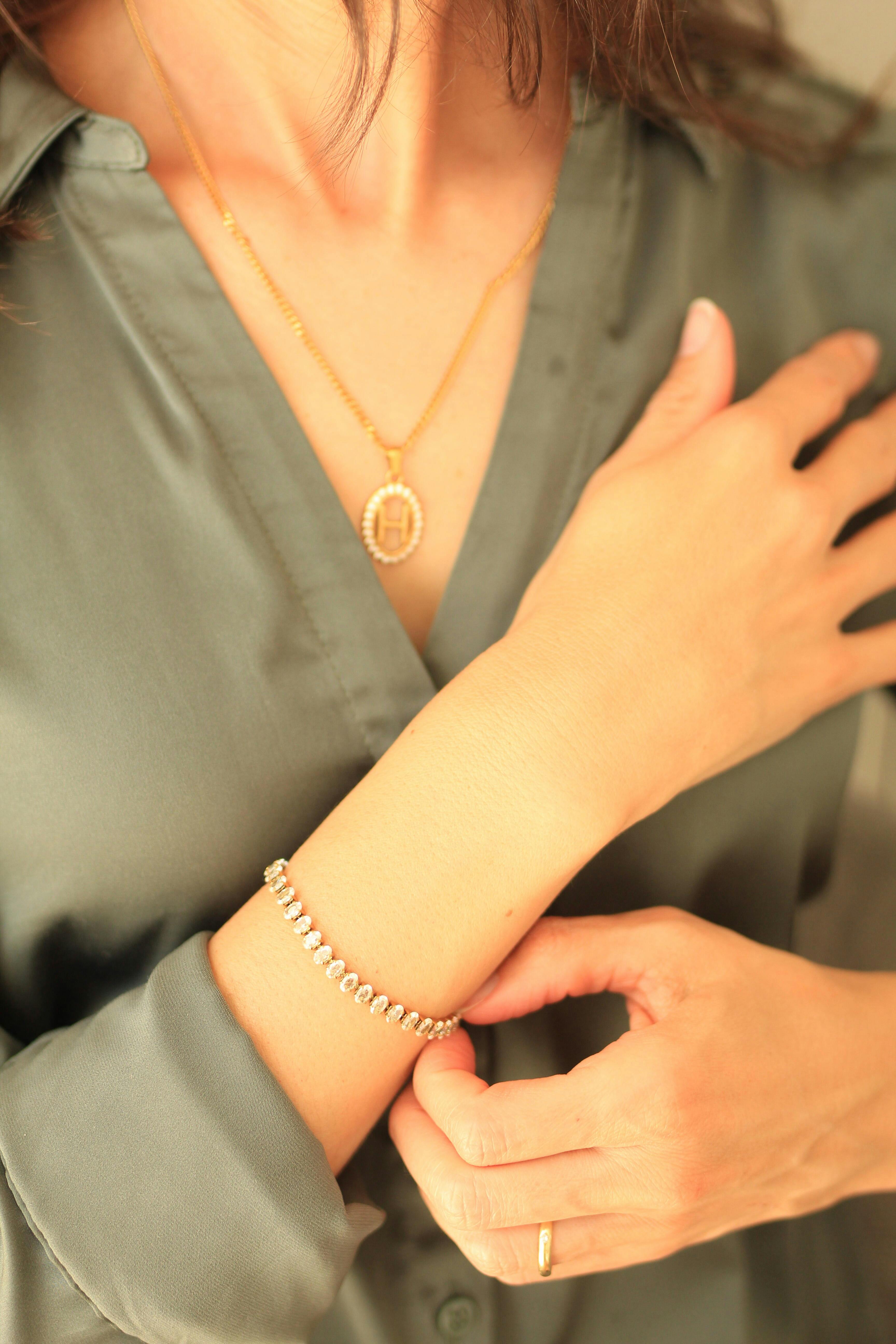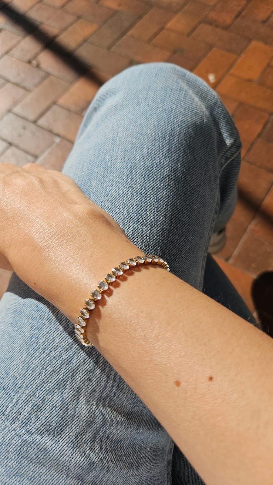 Enhance your look with this bracelet, featuring luxurious 18k gold plating and brilliant oval-cut diamond simulants. A timeless and elegant piece, perfect for any occasion.